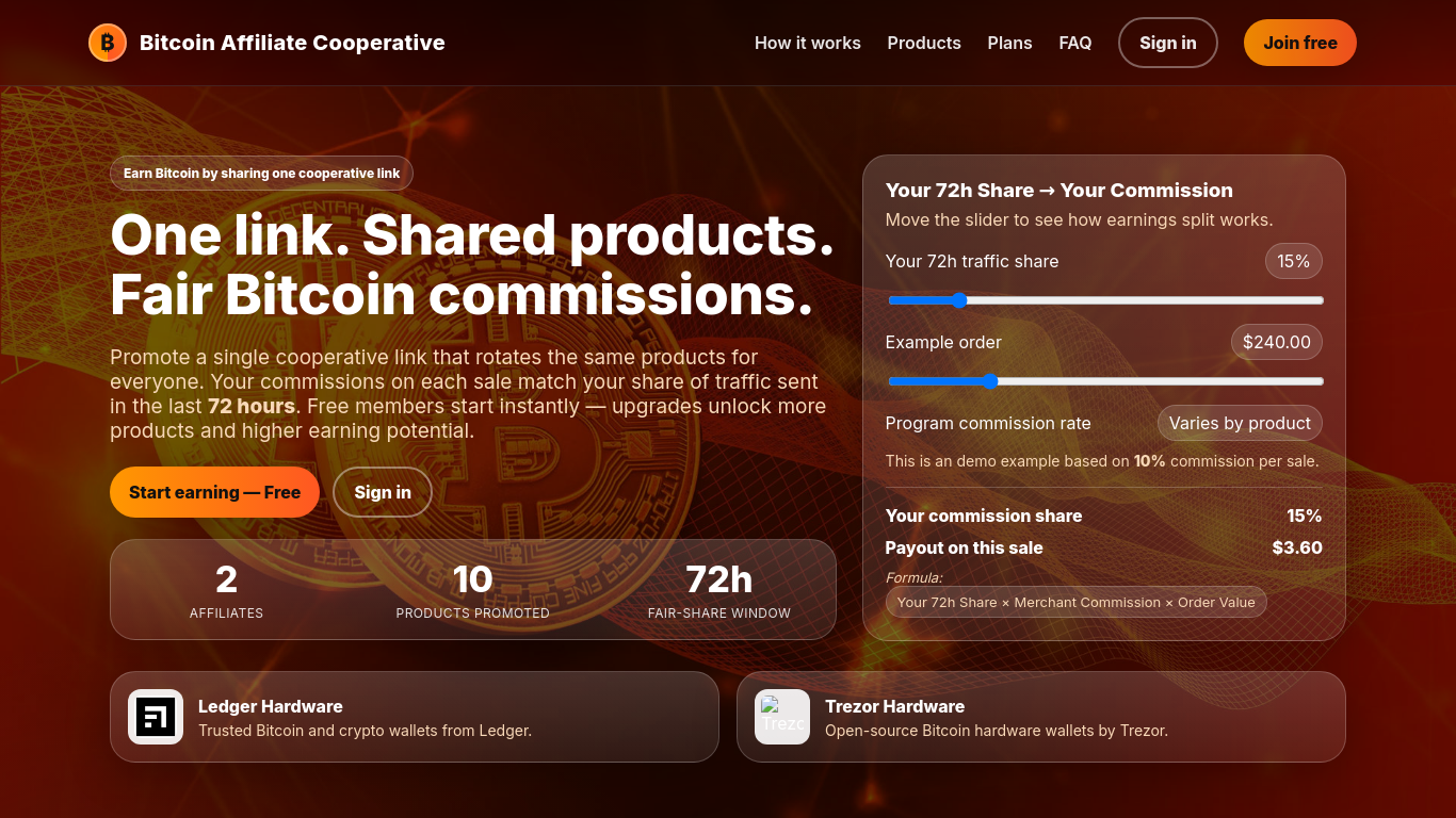 Promote a single cooperative link that rotates the same products for everyone. Your commissions on each sale match your share of traffic sent in the last 72 hours. Free members start instantly — upgrades unlock more products and higher earning potential.